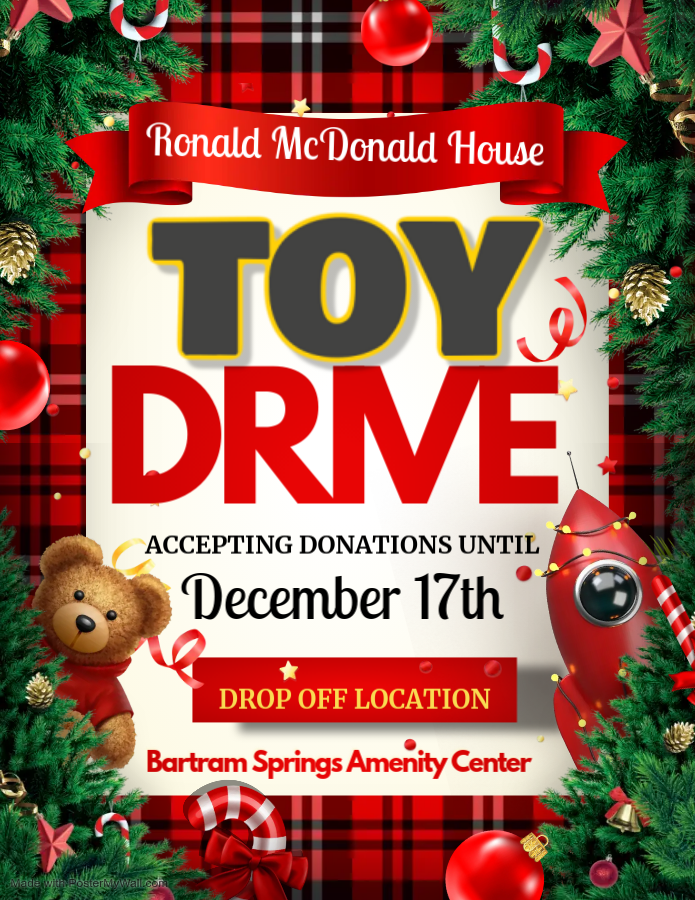 8:00 am - 5:00 pm Last day for Toy Drive December 17, 2024 @ 8:00 am - 5:00 pm Last day for Toy Drive Toy drop off at the Amenity Center